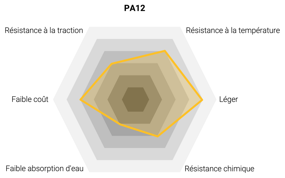 Matériau PA12Le polyamide 12 (PA12), également connu sous le nom de nylon 12, est un thermoplastique polyvalent qui se distingue par sa faible absorption d'humidité, son excellente résistance chimique et sa flexibilité. Ces propriétés le rendent adapté aux applications dans les conduites de carburant automobiles, les tuyaux flexibles et l'isolation des câbles électriques. Le PA12 maintient la stabilité dimensionnelle et les performances mécaniques sur une large plage de températures, garantissant ainsi sa fiabilité dans les environnements exigeants. Sa facilité de traitement et sa compatibilité avec diverses techniques de fabrication renforcent encore son attrait dans diverses applications industrielles.