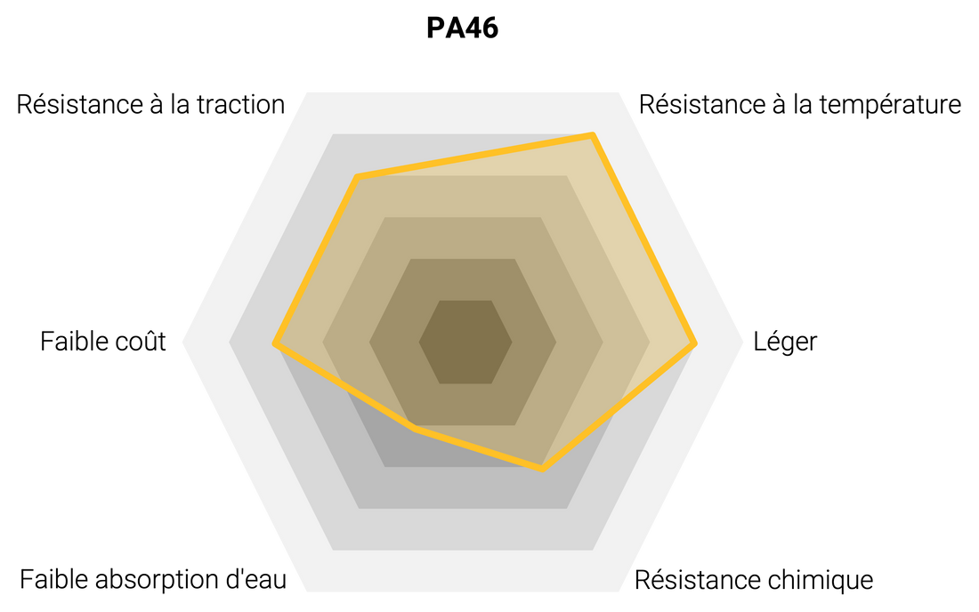 Matériau PA46Le polyamide 46 (PA46) est un thermoplastique hautes performances connu pour sa stabilité thermique, sa résistance mécanique et sa résistance à l'usure exceptionnelles. Il peut résister à une exposition prolongée à des températures élevées, ce qui le rend idéal pour les applications exigeantes dans les moteurs automobiles, les machines industrielles et les composants électriques. Le PA46 présente une excellente stabilité dimensionnelle et une résistance aux produits chimiques et à l'humidité, garantissant des performances fiables dans des environnements difficiles. Ces attributs en font un matériau privilégié pour les composants nécessitant une durabilité et des performances élevées sous contrainte.