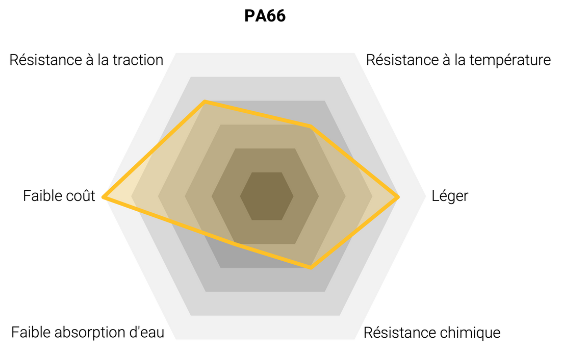 Matériau PA66Le polyamide 66 (PA66), également connu sous le nom de nylon 66, est un thermoplastique technique reconnu pour sa résistance mécanique, sa rigidité et sa résistance thermique supérieures. Il fonctionne exceptionnellement bien dans les applications exigeantes, en maintenant la stabilité sous des contraintes élevées et des températures élevées. Le PA66 présente également une excellente résistance à l'usure et une résilience chimique, ce qui le rend adapté aux composants automobiles, aux machines industrielles et aux systèmes électriques. Ses excellentes performances dans diverses conditions garantissent son utilisation généralisée dans les applications techniques et industrielles.
