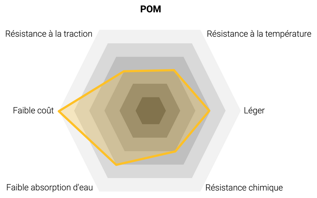 Matériau POMLe polyoxyméthylène (POM), également connu sous le nom d'acétal, est un thermoplastique technique hautes performances réputé pour ses excellentes propriétés mécaniques, notamment sa résistance élevée, sa rigidité et son faible frottement. Ces caractéristiques font du POM un matériau idéal pour les composants de précision tels que les engrenages, les roulements et les fixations, où la stabilité dimensionnelle et la résistance à l'usure sont cruciales. Sa faible absorption d'humidité et sa résistance chimique renforcent encore son adéquation aux applications dans les secteurs de l'automobile, de l'électronique et des biens de consommation.