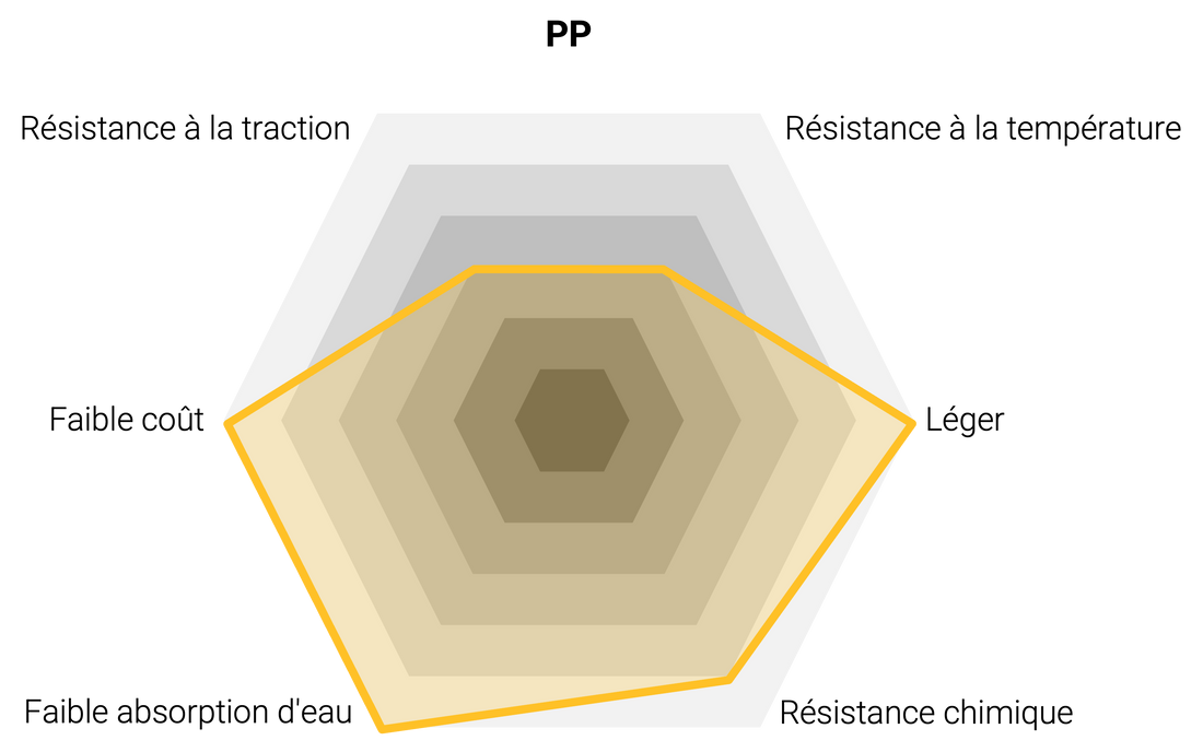 Matériau PPLe polypropylène (PP) est un polymère thermoplastique polyvalent caractérisé par sa faible densité, son excellente résistance chimique et sa grande durabilité. Son point de fusion est d'environ 160 °C, ce qui le rend adapté aux applications nécessitant une stérilisation. Le PP est largement utilisé dans de nombreux secteurs, notamment l'emballage, l'automobile, le textile, les appareils médicaux et les biens de consommation, grâce à sa résistance et à sa rentabilité. Sa résistance à l'humidité et à de nombreux produits chimiques en fait un choix fiable pour une variété d'applications exigeantes.