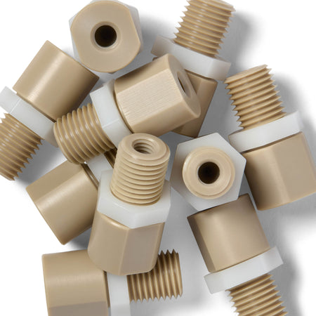 Le raccord de cloison HPLC en PEEK (polyétheréthercétone) est un composant spécialisé conçu pour les tubes capillaires de 1/8" dans les systèmes de chromatographie liquide haute performance (HPLC). Ce raccord traversant unique permet une connexion pratique et sans outil à chaque extrémité, offrant un joint sûr et sans fuite entre le tube capillaire et le système HPLC.
