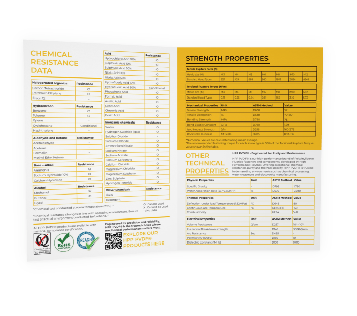 High-quality A4 datasheet that presents the key performance characteristics of PVDF in a clear, professional format. Printed on 250 gsm gloss paper for durability and a premium feel, it includes comprehensive technical data covering mechanical, thermal, electrical, and chemical properties.