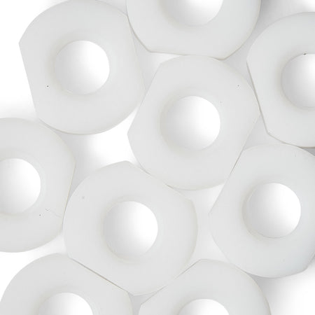 Nos écrous double largeur PTFE ou 'Teflon' sont fabriqués à partir de 100% PTFE, ils ne doivent pas être confondus avec l'acier inoxydable revêtu. L'utilisation du PTFE comme seul matériau permet d'afficher des caractéristiques exceptionnelles sans compromis.